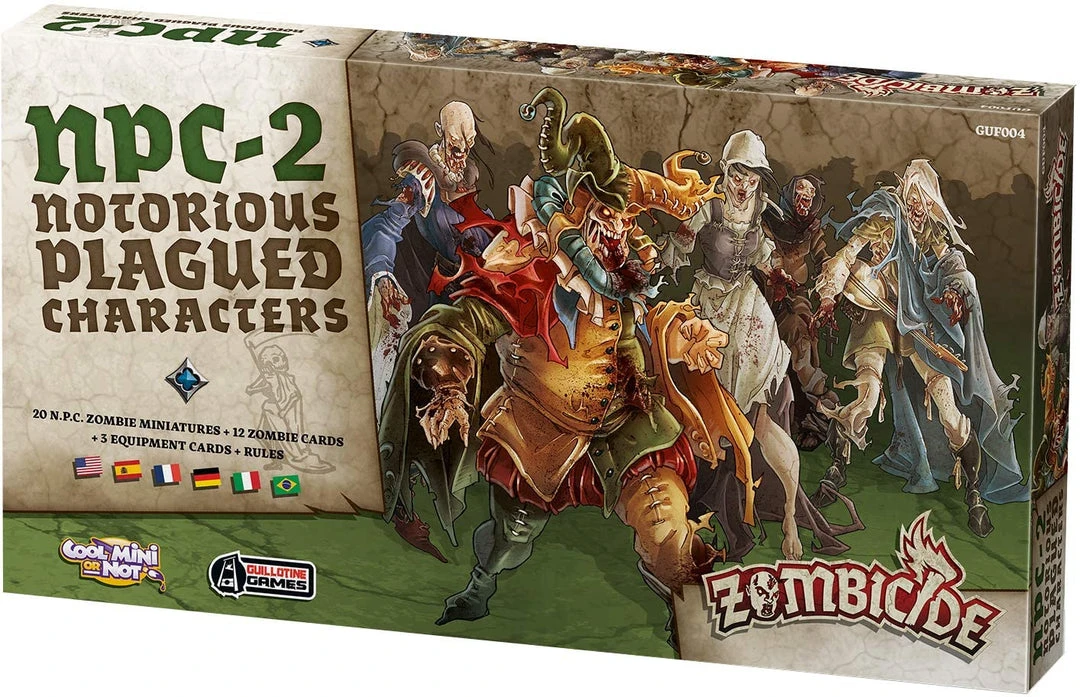 Raise thy swords! The second Notorious Plagued Characters set for Zombicide: Black Plague contains five new types of Zombies and four miniatures of each type. Players also get 12 new spawn cards and three new vault cards that hold powerful and deadly weapons. So who makes up this new company of the undead. There is a Nobleman, a Jester, a Tavern Maid, an Elf Bard, and a Plague Monk. Each one is rendered in detailed, rotting glory!