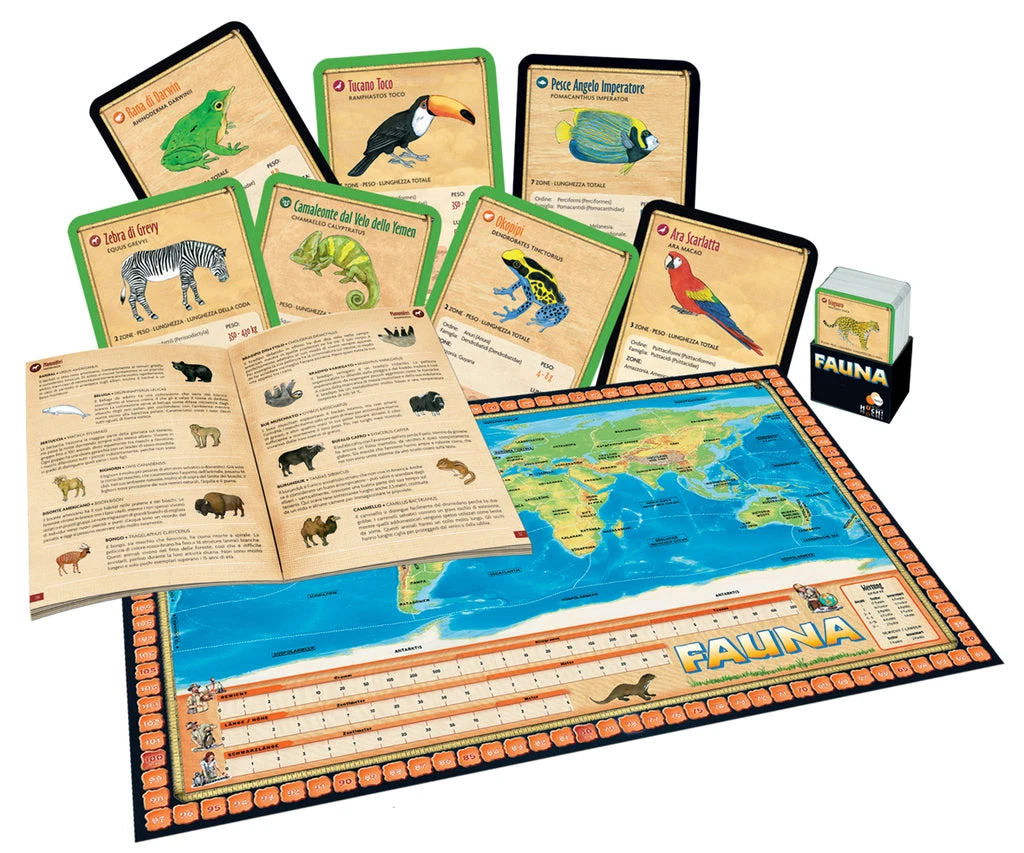 Kids will enjoy family fun testing their knowledge and learning about animals all around the world with the FoxMind Fauna Game. Players must answer all sorts of questions about animals. In this Fauna board game, players are not expected to know all the answers but should be able to make educated guesses. Points are won even for being close because partial points are given. The more kids play, the better they get. Included is a board, 180 animal cards with 360 animals, one card box, 42 bet markers, 30 evaluation markers and one lion marker. This Animal board game is recommended for ages 8 and up and can be played by up to six players.