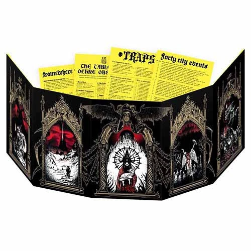 MORK BORG GM Screen: A five-paneled portrait wall of death. Printed with gold metallic ink on one side and vivid neon yellow on the other. The front is all art, five scenes of various locales and important characters in the Dying world. The GM-facing side sports a wide array of tables and rules summaries that might come in handy during play.