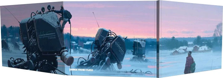 A top quality, deluxe GM Screen for the Things from the Flood roleplaying game. The screen is in landscape format, with Simon Stalenhag’s awesome art on the outside and useful tables on the inside.