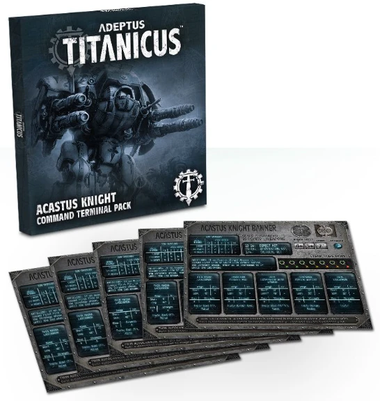 For each banner of Knights you field, you require a Command Terminal, which provides a detailed surface on which to track the status, damage and weapons of your Knights, as well as the Orders you’ve issued to them each turn. This set of five large-format card Command Terminals includes enough to add several banners of Knights to your games of Adeptus Titanicus.