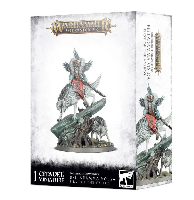 This ancient Soulblight vampire is as deadly as they come. Her scimitar and lupine companions reap a fearsome tally, but Belladamma is also a skilled practitioner of magic and a master of the Lycancurse, transforming her prey into Dire Wolves under her command.