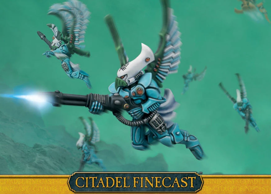 The Swooping Hawks are the swift airborne support of the Aeldari warhost. They wear wings made of vibrating feather plates that incorporate small gravitic lifters, allowing them to soar high above the battlefield before swooping down on enemy units, firing into them with lasblasters and grenade packs, before disengaging and leaping back into the sky. While they may be lightly armed and armoured, they are the perfect unit to take out enemy artillery, hunt down fast-moving vehicles and pin down flanking units.