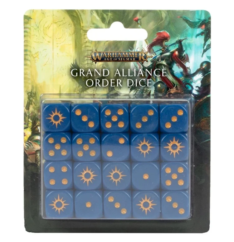 The set contains 20x 16mm, round-edged dice with traditional pips denoting the numbers, but with a Sigmarite halo icon in place of the 6. The dice are all blue – a colour synonymous with the Realm of Heavens – with gold-coloured pips, and come presented in a blistered clampack covered in thematic artwork.