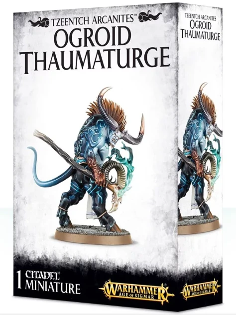 This multi-part plastic kit contains the 16 components necessary to assemble a hulking, imposing Ogroid Thaumaturge. Standing at almost twice the height of a Kairic Acolyte, and covered in sculpted sigils, he’s a model who can be easily painted to represent the incredible arcane energy within. He’s armed with a thaumaturge staff, topped with a horned skull emitting magical flame.