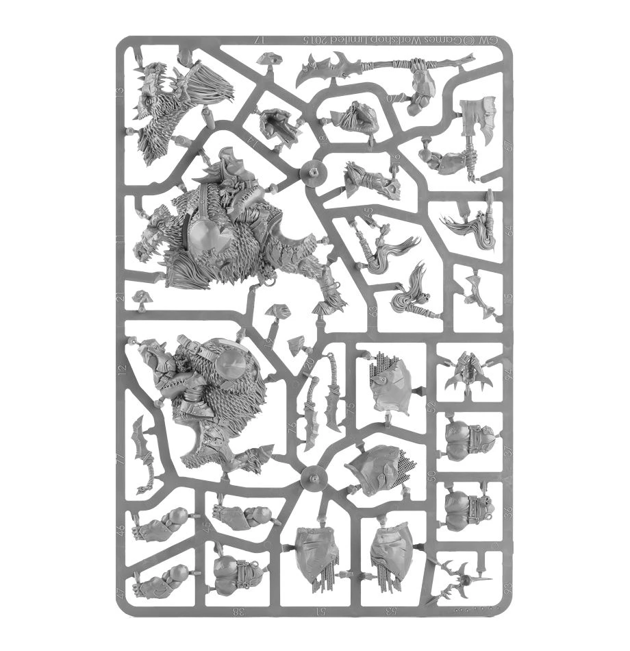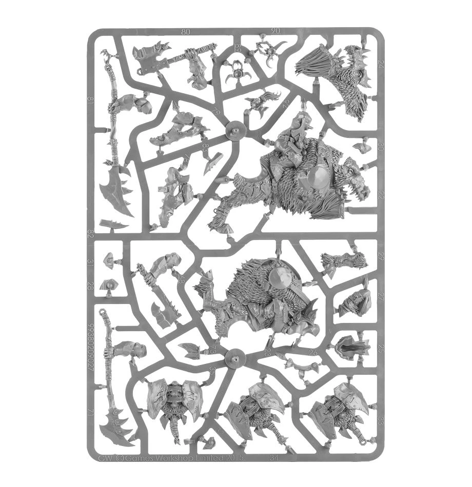 This multi-part plastic kit contains all the parts necessary to assemble three orruk Gore-gruntas, savage orruks riding massive, armoured, betusked beasts. The orruks can be armed with pig-iron choppas, or jagged gore-hackas, with an optional Gore-grunta boss featuring his own head, weapon and grunta options. 100 components in total, with three Citadel 90x52mm Oval bases.