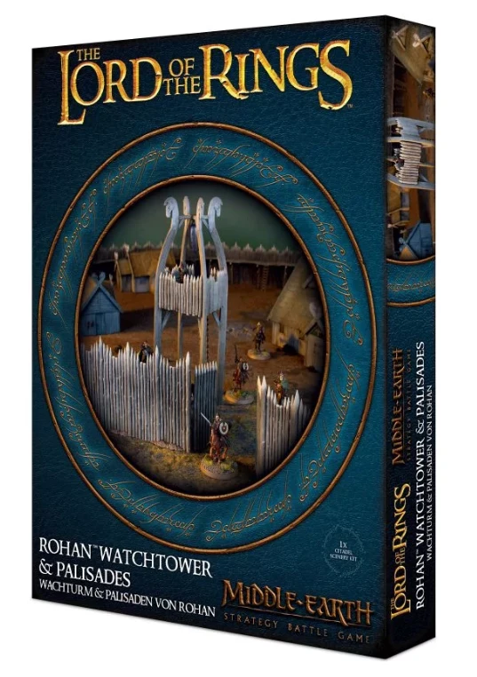 This modular, multipart plastic terrain kit enables you to build one Rohan Watchtower, 4 Palisades and a gate. Each Palisade includes a walkway that is 25mm wide to accommodate archers or other infantry manning the walls. The Palisade gate can be assembled to open or close freely and can hold a removable crossbeam with which the defenders can lock the gate.