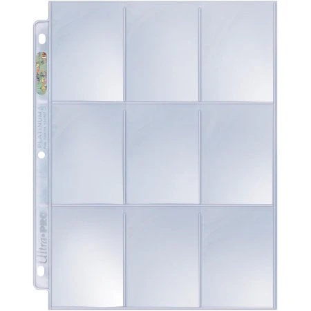 Ultra PRO Platinum Hologram Pages in nine-pocket style. Archival quality pages that holds standard-sized cards with 2-1/2″ X 3-1/2″ dimensions or smaller. Also ideal for sticker cards, coupons and other collectibles. Pages are clear on both sides and fit in our standard-size 3-ring albums. (209D-1)