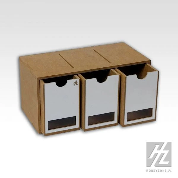 The OM01b is three-drawer storage module made from machine cut (not laser cut) plywood or MDF (dense particle board) wood with windows made of clear acrylic. This module can work on its own but it is designed to connect or be stacked with other modules that are part of HobbyZone Modular Workshop System. Modules connect using magnets that are included and you can always change the configuration of the modules according to your storage needs. This module comes in kit form, consists of precision fitted parts and assembly instructions. Wood glue is required for assembly (not included).