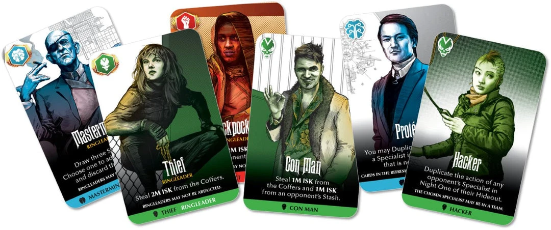 Grifters is a hand-building game that has all the fun of deck-building, without the deck. Players take on the role of powerful crime bosses, building their criminal organizations by carefully recruiting new operatives with specialized skills and directing their team’s nefarious deeds. All of your specialists are either in play or in your hand, ready to be used as you command. This unique handbuilding mechanic gives you total control of your strategy.